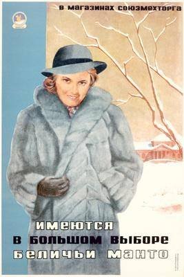 Рекламный плакат СССР, Беличьи манто союзмехторга имеются в большом выборе. Советский рекламный плакат. Советское - значит отличное. Возможна печать на различных материалах: варианты материалов для печати плаката Цена зависит от размера и материала печати и указана за метр квадратный. Размер печатного плаката можно менять.