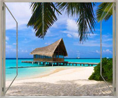Вид из окна на тропический пляж, расширение пространства помещения. Интерьерная, широкоформатная печать для оформления дизайна Вашего помещения. выбрать материал для печати обоев. Цена указана за метр квадратный печати.
