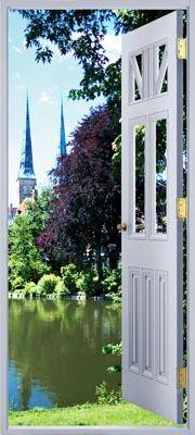 Дверь в другой мир, вид на замок, пруд и парк. Интерьерная, широкоформатная печать для оформления дизайна Вашего помещения. выбрать материал для печати обоев. Цена указана за метр квадратный печати.
