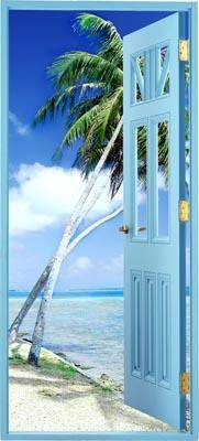 Дверь в другой мир, вид на пляж и пальмы на берегу океана. Интерьерная, широкоформатная печать для оформления дизайна Вашего помещения. выбрать материал для печати обоев. Цена указана за метр квадратный печати.
