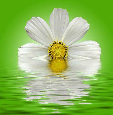 Предлагаем Вам стильное и умеренно дизайнерское изображение цветок белой ромашки на зеленом фоне и его отражение в воде. Широкоформатная печать для оформления дизайна помещения. выбрать материал для печати обоев. Цена указана за метр квадратный печати.