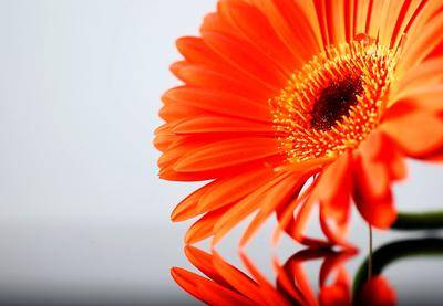 Цветок оранжевой герберы и его отражение на гладкой поверхности