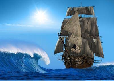 Постер Путешествие в новый свет корабль парусник на волнах океана. Картина для оформления дизайна интерьера помещения. варианты материалов для печати и оформления постера. Цена зависит от материала и указана за метр квадратный.