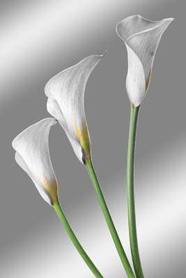 Художественное фото, постер: изящество и красота белых калл. Три цветка на серебряном фоне. выбрать материал для печати и вид оформления постера. Цена указана за метр квадратный.