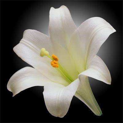 Цветок нежной белой лилии на черном фоне, арт обои для интерьера помещения и легкого, воздушного дизайна. варианты печати арт обоев и фресок для стен. Цена указана за метр квадратный печати.