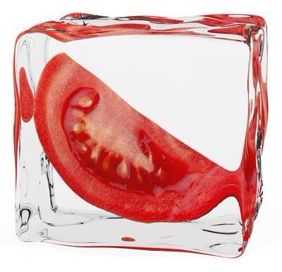 Свежий фрукт красный сочный помидор в кубике прозрачного льда фотография высокого разрешения для оформления интерьера и рекламы. Макросъемка. выбрать материал для печати постера и вид оформления. Цена указана за метр квадратный печати.