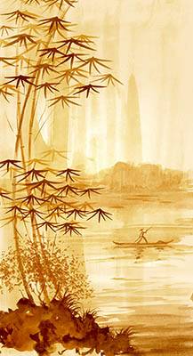 Фреска восточной живописи в стиле суми-э Прибрежный бамбук и одинокая лодка. Интерьерная, широкоформатная печать для оформления дизайна Вашего помещения. выбрать материал для печати фрески. Цена указана за метр квадратный печати.