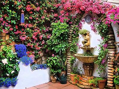 Предлагаем Вам стильные и яркие арт обои, цветы и фонтан в итальянском дворике. Печать на заказ по размерам клиента для оформления дизайна помещений. варианты печати арт обоев и фресок. Цена указана за метр квадратный изделия.