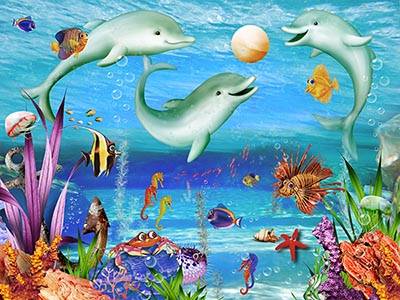 Веселые дельфины и подводный мир, яркий сюжет для детской комнаты. Интерьерная, широкоформатная печать для оформления дизайна Вашего помещения. выбрать материал для печати обоев и фресок. Цена указана за метр квадратный.