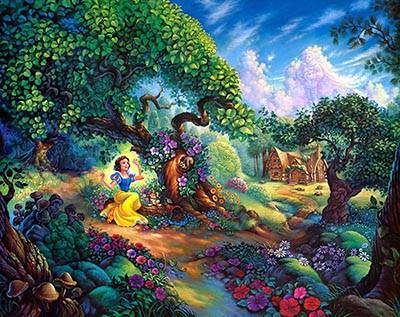 Белоснежка в сказочном лесу, современная живопись для детей. Интерьерная, широкоформатная печать для оформления дизайна Вашего помещения. выбрать материал для печати фрески или обоев. Цена указана за метр квадратный.