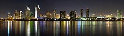 Яркая панорама ночного города Сан-Диего. Интерьерная, широкоформатная печать для оформления дизайна Вашего помещения. выбрать материал для печати обоев или скинали. Цена указана за метр квадратный печати.