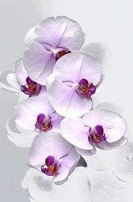 Предлагаем Вам изображение высокого разрешения с эффектом 3D, цветы пятнистой белой орхидеи с розовыми пятнышками на фоне камней и воды, для изготовления фотообоев. Интерьерная печать для оформления дизайна помещения. выбрать материал для печати обоев. Цена указана за метр квадратный.