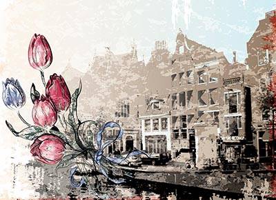 Предлагаем стильное, графическое изображение набережной города в стиле гранж, Амстердам город тюльпанов. Широкоформатная печать для оформления дизайна помещения. выбрать материал для печати фрески. Цена указана за метр квадратный печати.