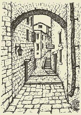 Предлагаем графическое изображение улочки старого города для Вашего интерьера. Широкоформатная печать для оформления дизайна помещения. выбрать материал для печати фрески. Цена указана за метр квадратный печати.