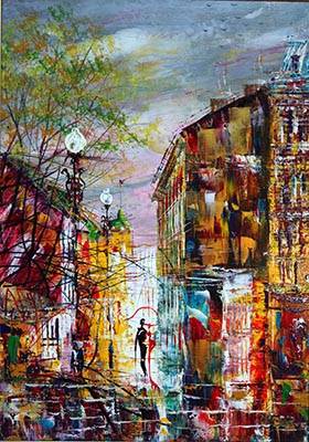 Арт постер для оформления дизайна интерьера прогулка по городу. Предлагаем печать художественных работ современной живописи на холстах и текстурах для оформления помещений. Холсты натягиваем на деревянный подрамник. варианты печати и оформления картины. Материал подбирается для наиболее точной передачи техники живописи. Цена зависит от материала и указана за метр квадратный печати на холсте.