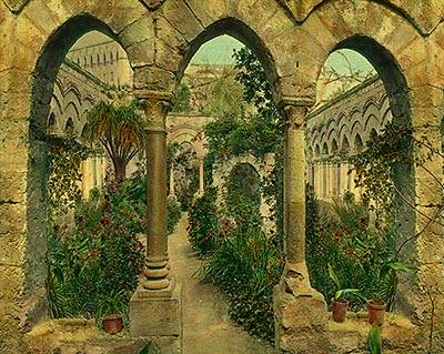 Предлагаем Вам изображение высокого разрешения Внутренний дворик с каменными готическими арками. Широкоформатная печать для оформления дизайна помещения. выбрать материал для печати обоев и фресок. Цена указана за метр квадратный.
