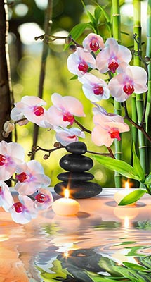 Романтический сюжет, цветы орхидеи, бамбук камни и свечи. Отражение в воде. Интерьерная, широкоформатная печать для оформления дизайна Вашего помещения. выбрать материал для печати обоев. Цена указана за метр квадратный печати.