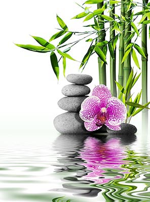 Предлагаем Вам красивое и объемное изображение цветок розовой орхидеи на камнях и на фоне зеленого бамбука. Интерьерная, широкоформатная печать для оформления дизайна Вашего помещения. выбрать материал для печати обоев. Цена указана за метр квадратный печати.