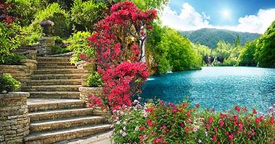 Предлагаем Вам красивое изображение старый парк с каменной лестницей и видом на озеро. Данный сюжет безусловно визуально увеличит пространство вашего интерьера, стена просто перестанет существовать. выбрать материал для печати обоев. Цена указана за метр квадратный.