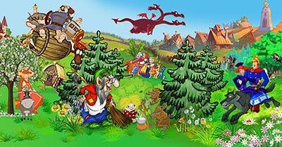 Изображение для печати в детскую комнату, герои Русских мультиков и сказок, Илья Муромец, Змей Горыныч, Баба - яга и другие. Интерьерная, широкоформатная печать для оформления дизайна детского помещения. выбрать материал для печати обоев. Цена указана за метр квадратный печати.