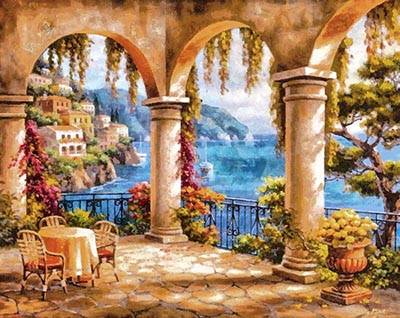 Предлагаем Вам живописное изображение цветущая терраса с видом на море. Интерьерная, широкоформатная печать для оформления дизайна Вашего помещения. выбрать материал для печати фрески. Цена указана за метр квадратный печати.