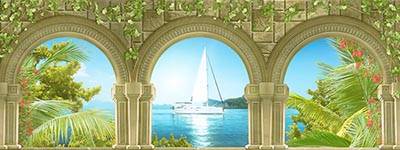 Окно с арками, романтический вид на море с террасы. Интерьерная, широкоформатная печать для оформления дизайна Вашего помещения. выбрать материал для печати фрески. Цена указана за метр квадратный печати.