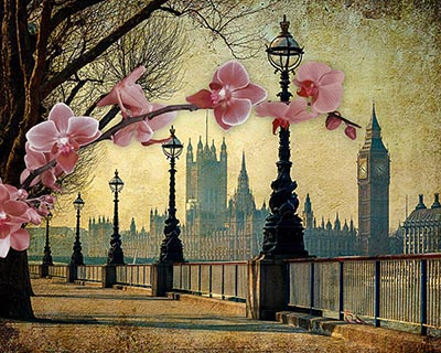 Предлагаем Вам красивое изображение цветы розовой орхидеи на фоне набережной города Лондон для изготовления фрески. Интерьерная печать для оформления дизайна Вашего помещения в стиле гранж. выбрать материал для печати фрески. Цена указана за метр квадратный печати.