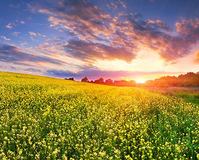 Фотопанно для дизайна вашей комнаты, пейзаж природы, закат над полем с цветами. Интерьерная печать обоев и фресок с цифровых копий высокого разрешения. варианты печати обоев. Цена указана за метр квадратный.