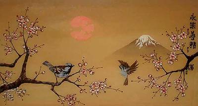 Репродукция картины японской живописи Птицы на ветке сакуры и гора Фудзи. Предлагаем печать художественных работ восточных художников на холстах и текстурах для оформления помещений. Холсты натягиваем на деревянный подрамник. варианты печати и оформления картины. Материал подбирается для наиболее точной передачи техники живописи. Цена зависит от материала и указана за метр квадратный печати на холсте.