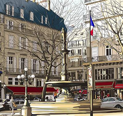 Предлагаем Вам художественное изображение современной графики Городская площадь в Париже. Широкоформатная печать для оформления дизайна помещения. выбрать материал для печати фрески. Цена указана за метр квадратный печати.