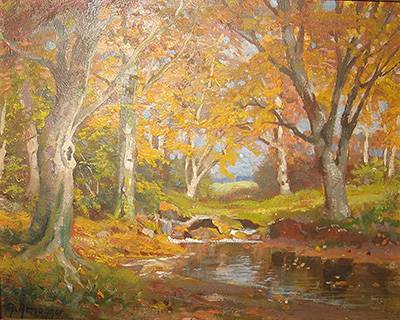 Репродукция картины Осенний лес, американская художница Dollie Nabinger. Живопись в классическом стиле. Предлагаем печать работ известного мастера на холстах и других текстурах для оформления дизайна Вашего помещения. Холсты натягиваем на подрамник. варианты печати и оформления картины Цена указана за метр квадратный печати на холсте.